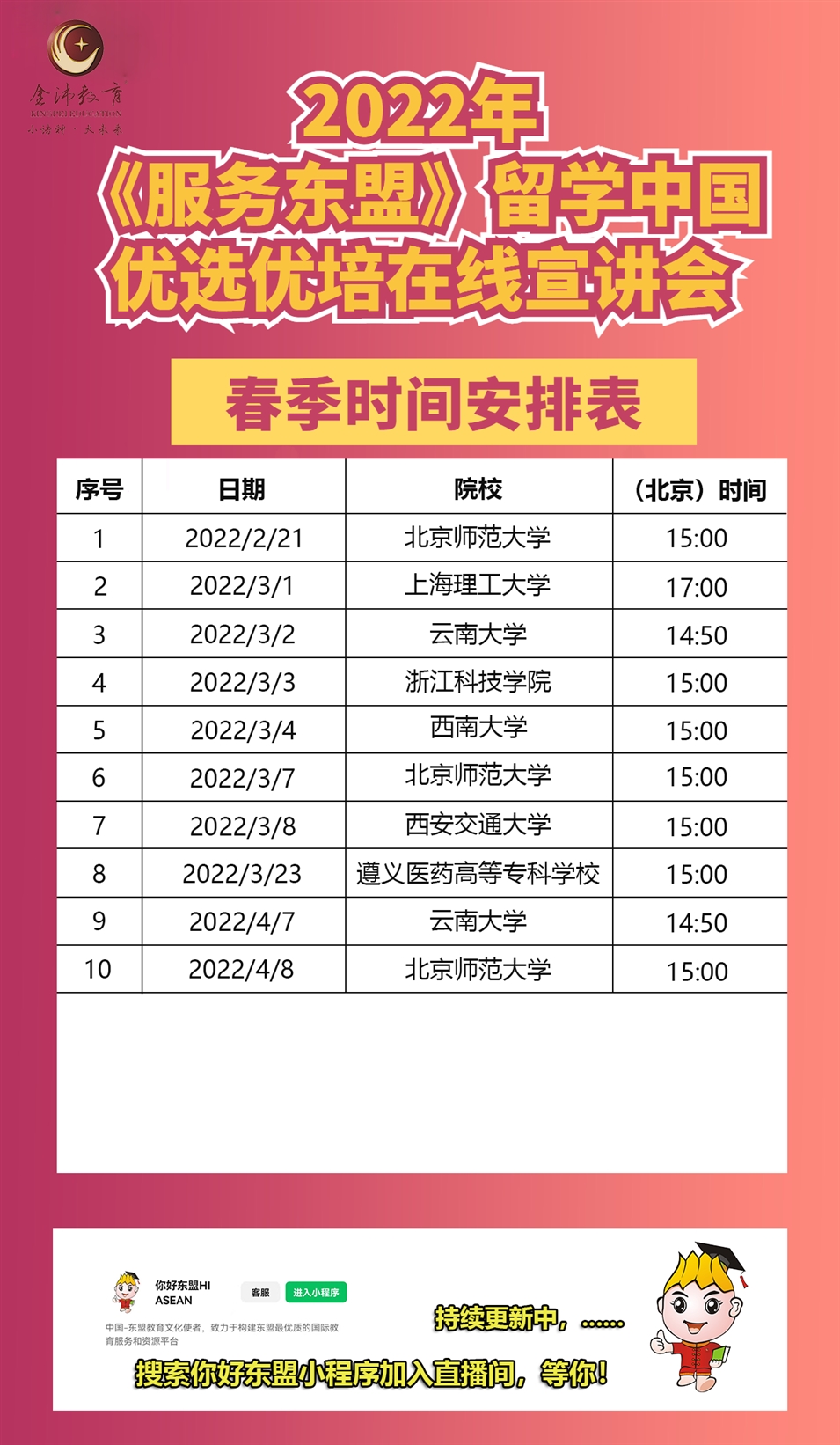 2022年2月21日起由我司聯(lián)合多所高校開展的“2022年春季留學中國優(yōu)選優(yōu)培線上直播宣講會”將在“你好東盟”微信小程序上進行開播。