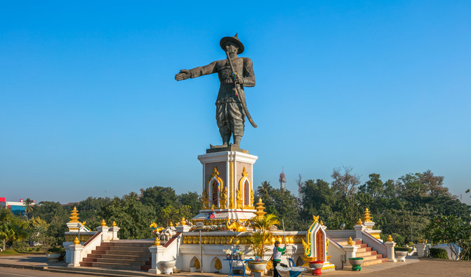 湄公河邊上有一片很大的綠地公園,叫湄公河邊公園。公園里有一尊國王Chao Anouvong的雕像,面朝泰國,似乎在向泰國討伐失去的土地。