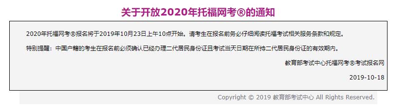 教育部考試中心托福網(wǎng)考考試報(bào)名網(wǎng)發(fā)布了通知,2020年托福報(bào)名將于2019年10月23日上午10點(diǎn)開始。