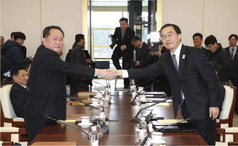 當(dāng)?shù)貢r(shí)間2018年1月9日,韓國(guó)和朝鮮代表在板門店韓方一側(cè)“和平之家”舉行韓朝高級(jí)別會(huì)談,就朝方派代表團(tuán)參加平昌冬奧會(huì)、南北關(guān)系改善等共同關(guān)心的問題進(jìn)行討論。這是時(shí)隔兩年多之后,韓朝雙方再次實(shí)現(xiàn)高級(jí)別對(duì)話。