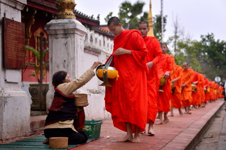 在老撾的許多地方,布施是一道獨(dú)特的佛教風(fēng)景。每天拂曉,僧人們會(huì)離開寺院,身披橙色袈裟,結(jié)隊(duì)到街道上或村莊里化齋。虔誠的佛教徒跪在道路的一邊,雙掌合十,接受僧侶誦經(jīng)祝福。誦經(jīng)完畢,僧侶們排著隊(duì)伍依次從人們的面前赤腳行過,人們把米飯、餅干、水果、雞肉等食物放進(jìn)僧人們的竹編小籃中。這些食品,就是僧人們一天的口糧。布施完了,僧人們回到寺廟進(jìn)餐。老撾僧侶恪守“過午不食”的修行規(guī)矩,從中午到夜晚,這些僧侶就不再進(jìn)食任何食品,而對(duì)于當(dāng)天不能吃完的食物,寺廟會(huì)把它們施舍給其他需要幫助的民眾,如貧困的小孩。老撾人虔誠地相信,這種施舍對(duì)于自己的未來和前途至關(guān)重要。