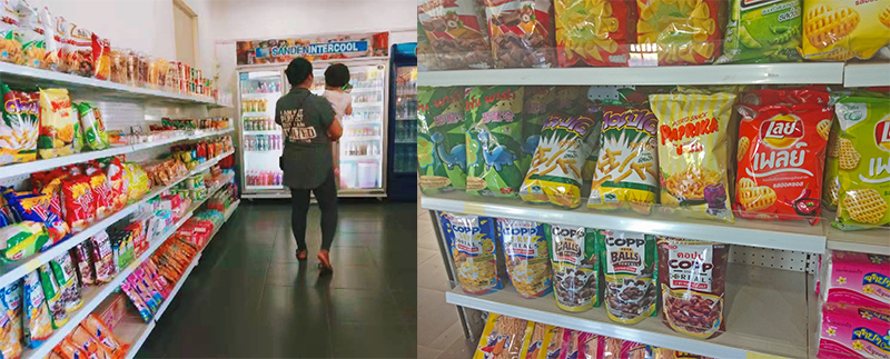 食堂區(qū)的小商店我們在《我在老撾國立大學的生活—食堂篇》中介紹過,其實可以猜到,既然開在食堂,那售賣的物品當然以食物為主,比如紅牛、牛奶、果汁、汽水之類的飲料應(yīng)有盡有,當然,薯片、餅干也是必不可少的。