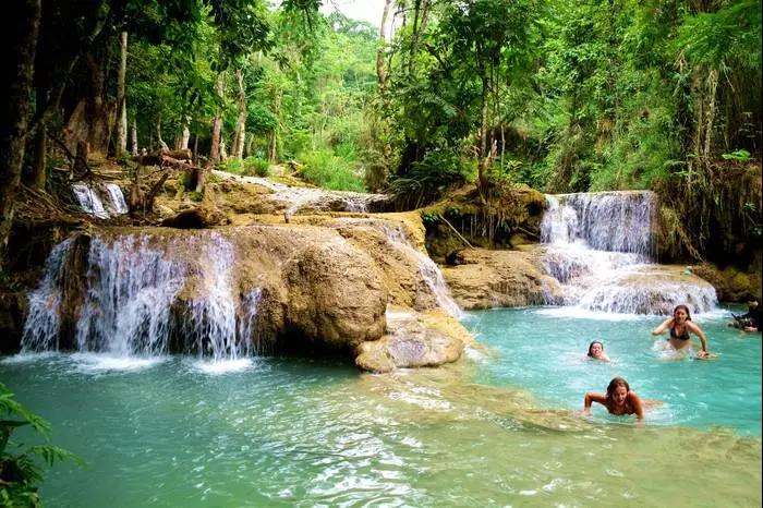 這里是一座寬廣的多層瀑布,瀑布總高100米,瀑布從石灰石山峰傾瀉而下,注入下面一系列清涼、翠綠色的水潭中。三層瀑布傾瀉而下,形成多個(gè)泛著藍(lán)綠色光澤的水潭,這里的景色像極了九寨溝的五彩池。陽光透過樹葉的間隙灑在涓涓溪流中,溪面就好像是一片片破碎的鏡子,點(diǎn)點(diǎn)地閃爍魚鱗般的光,如夢(mèng)似幻,讓人迷醉。在這里最熱門的活動(dòng)莫過于大樹繩索跳水,在水潭內(nèi)嬉戲不要著急上岸,可以安靜的在水里享受一下純天然免費(fèi)小魚SPA。