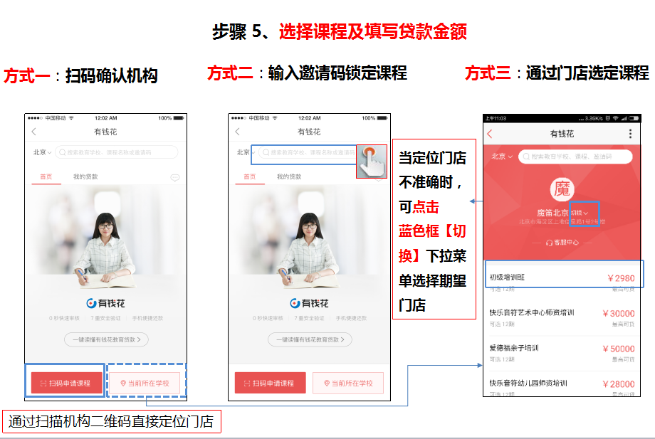 方式三:通過門店選定課程,填寫貸款金額【成交價(jià)格:與機(jī)構(gòu)確定的課程成交價(jià)格(包含首付);期望貸款金額:確定使用百度貸款的金額,成交價(jià)格-已交首付】