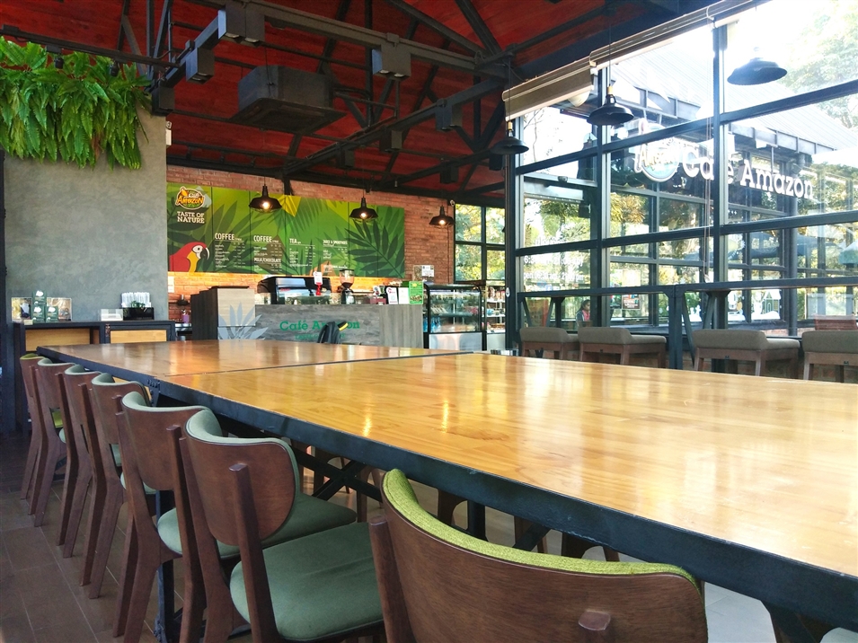 亞馬遜咖啡館的紅磚外墻與干凈明亮的落地窗相映,充滿休閑氣息。室內(nèi)寬敞整潔,歸本主義的原木桌椅,適合打發(fā)午后的閑暇時(shí)光。